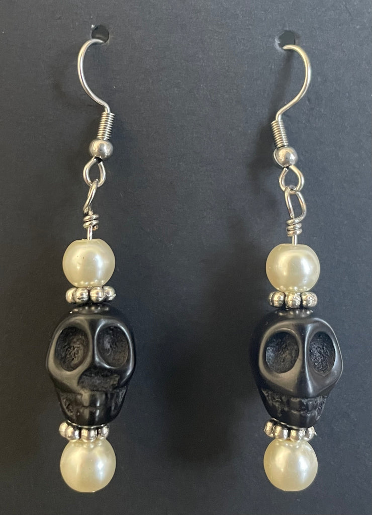 Inspired by the ghost story "The Green Ribbon" this necklace and earring set features a forest green sateen ribbon necklace with dyed black howlite skull and glass pearls and matching earrings hung from stainless steel ear wires.